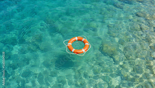 Naklejka premium Red and White Lifebuoy Floating on Calm Blue Sea Water