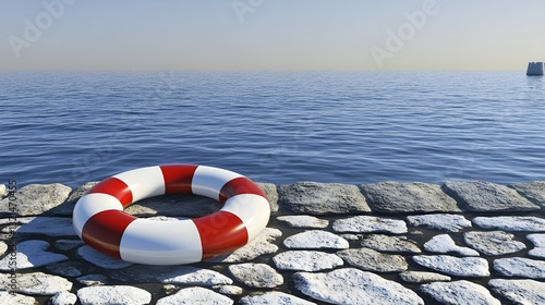 Naklejka premium Red and white lifebuoy on a stone pier.