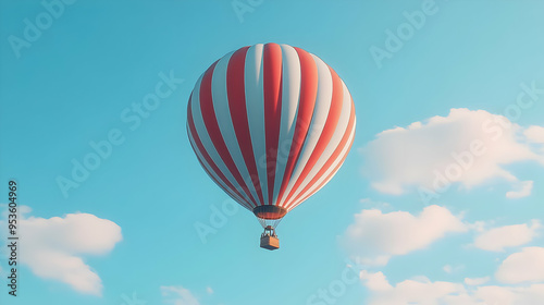 Fototapeta premium Red and White Striped Hot Air Balloon Flying in Blue Sky with White Clouds