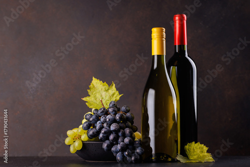 Naklejka premium Red and white wine bottles and fresh grapes