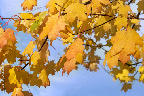 © Zbignev, Obraz premium red and yellow maple leaves against blue sky