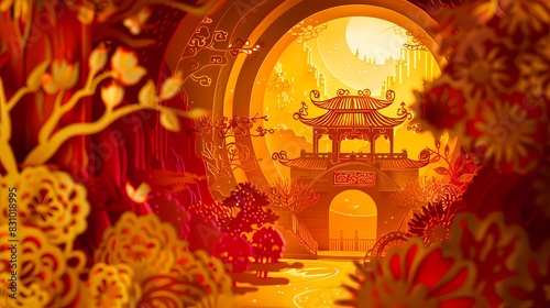 Obraz premium Red and yellow traditional style architectural paper cut poster background