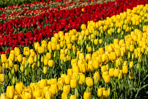 © olegmayorov, Fototapeta premium red and yellow tulips beautiful flowers under the spring sun