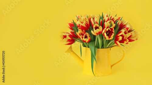 Fototapeta premium red and yellow tulips in tin can on yellow background
