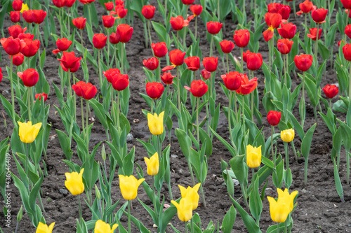 © Dmitrii Potashkin, Fototapeta premium Red and yellow tulips on a green background