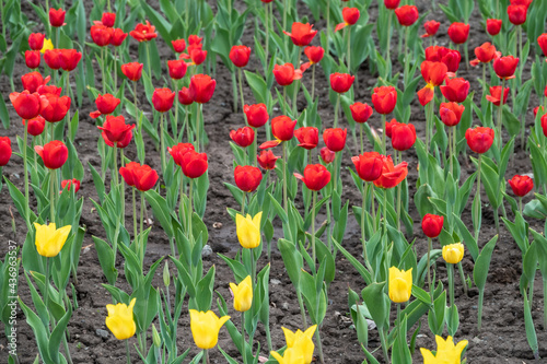 © Dmitrii Potashkin, Fototapeta premium Red and yellow tulips on a green background