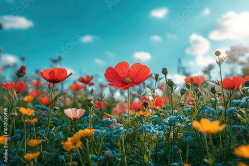 © Outkast, Obraz premium Red and Yellow Wildflowers in a Field Under a Blue Sky