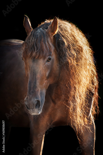© kwadrat70, Naklejka premium Red andalusian horse in sunlight on black background