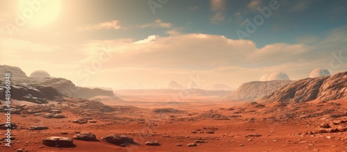 © Ilgun, Naklejka premium Red arid Mars with rocky features ideal for space exploration and sci fi settings offering a backdrop for a copy space image