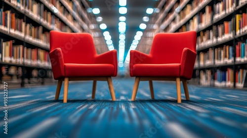 © Ndoomyim, Obraz premium Red Armchairs in a Blurred Library Setting