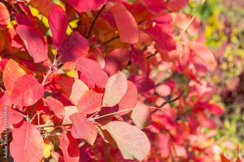 © Nikolay, Fototapeta premium red autumn leaves on branches, background