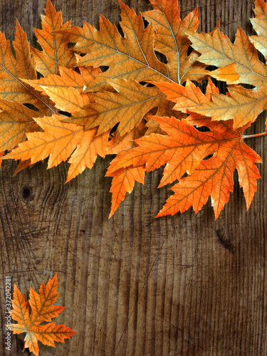 © Tetiana, Obraz premium red autumn maple leaves on an old wooden board background
