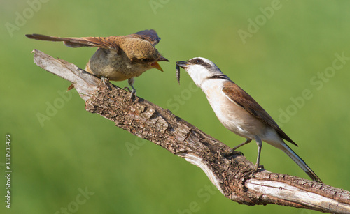 Obraz premium Red-backed shrike, Lanius collurio. A young bird asks for food from its...