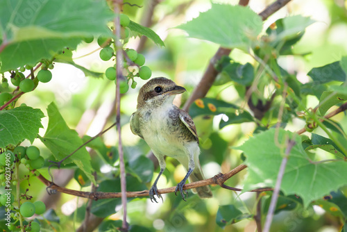 © edward-m, Naklejka premium Red-backed shrike (Lanius collurio) juvenile sitting on a branch of grape, Belarus