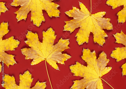 Obraz premium red background with dry yellow maple leaves