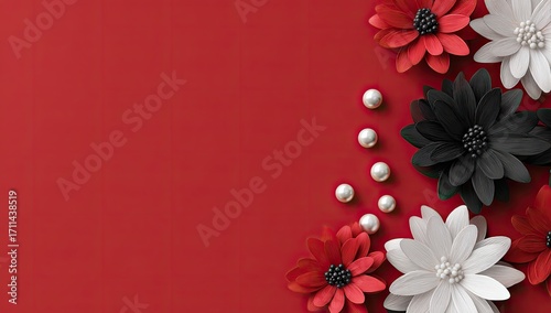 © muhammad, Obraz premium Red background with paper flowers and pearls