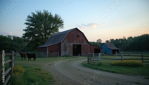 Obraz premium Red barn at sunset with grazing cows in rural countryside scene