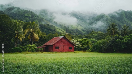 Obraz premium Red barn stands amidst lush greenery and misty mountains in a tranquil rural landscape showcasing nature's beauty