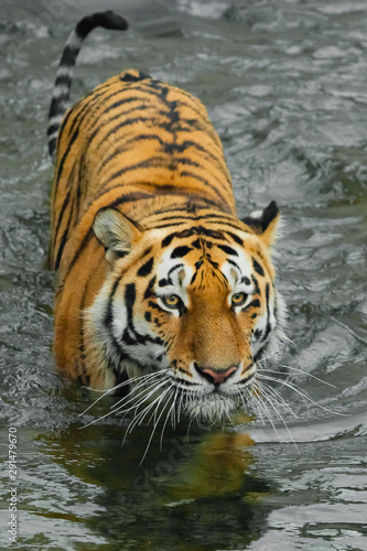 © Mikhail Semenov, Naklejka premium Red beast in black water.young tiger with expressive eyes walks on the water (bathes), a possible bright body of a predator close-up.