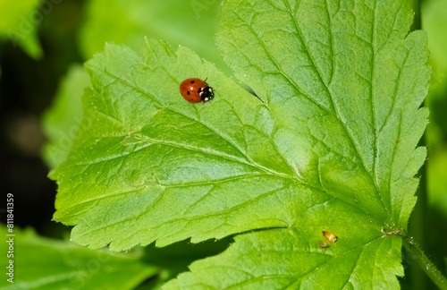 © Lana Kray, Fototapeta premium Red beetle, ladybug on a bright spring green leaf