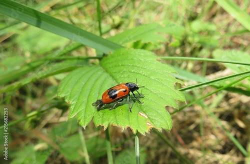© natalya2015, Fototapeta premium Red beetle on leaf in the garden, closeup