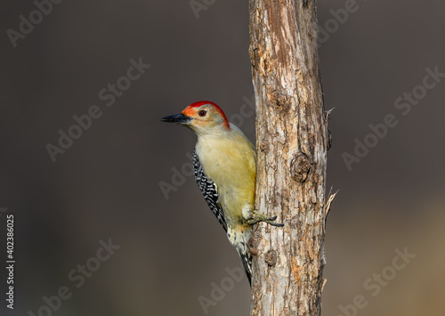 © FotoRequest, Fototapeta premium Red-bellied Woodpecker on Tree Trunk against Dark Background in Fall, Portrait