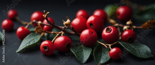 Obraz premium red berries and leaves on a black surface.