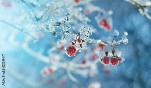 © Fanfo, Naklejka premium Red berries of viburnum with hoarfrost on the branches . closeup