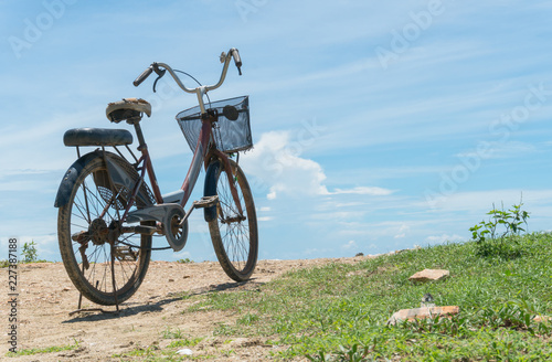 © steafpong, Obraz premium Red Bicycle on Beach and Blue Sky and Sea Close up View