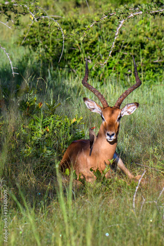 Naklejka premium Red-Billed Oxpecker on an Impala resting in a grassy area, Ruaha National Park, Tanzania
