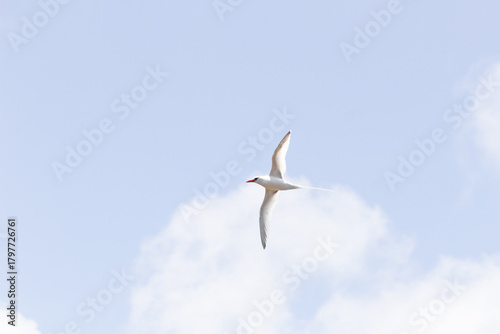 Obraz premium Red-billed tropic bird (Phaethon aethereus) in flight against a cloudy sky in...
