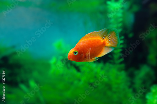 © oleg_p_100, Naklejka premium Red Blood Parrot Cichlid in aquarium plant green background. Funny orange colorful fish - hobby concept