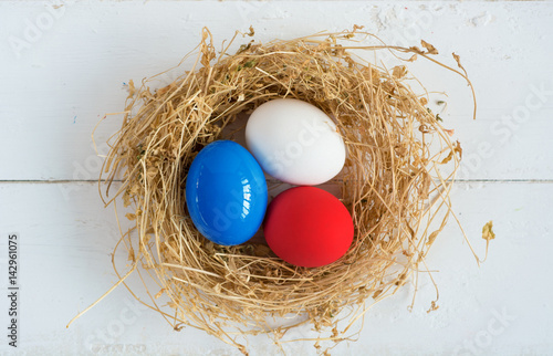 Fototapeta premium Red, blue, white eggs ( As flag of some countries ) in nest on rustic...