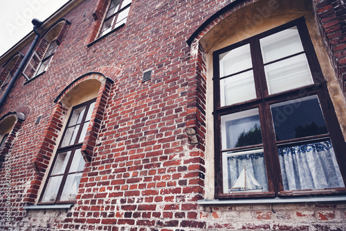 © olezzo, Obraz premium Red brick building facade, traditional Scandinavian architecture, Helsinki, Finland