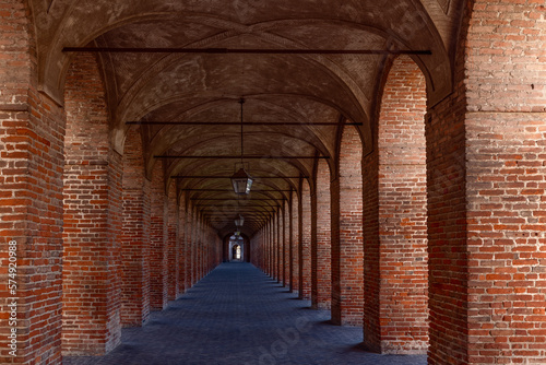 Naklejka premium Red brick columns and arches in Galleria degli Antichi in Sabbioneta town....