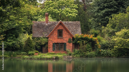 Obraz premium Red brick cottage by tranquil lake in lush garden.