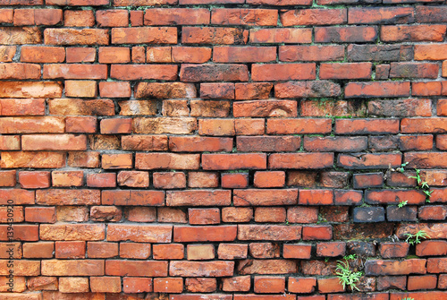 Obraz premium Red brick wall background. There are some grass in the cracks of the bricks.