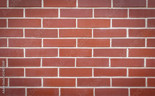 Obraz premium Red brick wall made of smooth brick. Seamless smooth brick wall texture with vignetted corners. Brick wall background, copy space for design and text.