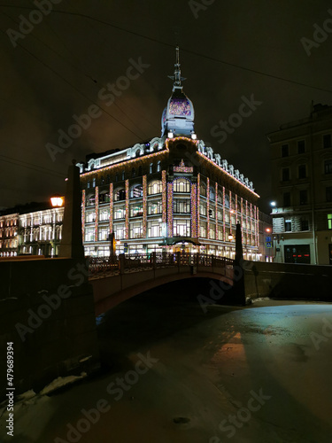 © Elena, Naklejka premium Red Bridge and the Trade House "At the Red Bridge" on the Moika River in St. Petersburg, decorated with garlands for Christmas and New Year.