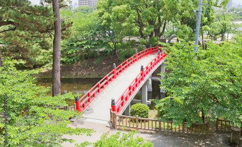 © joymsk, Fototapeta premium Red bridge in Okazaki Castle, Aichi Prefecture, Japan