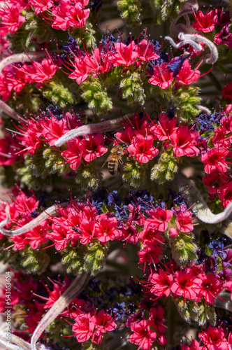 © amovitania, Fototapeta premium Red bugloss close-up with a pollinating bee.