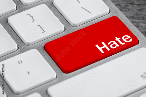 © New Africa, Fototapeta premium Red button with text Hate on computer keyboard, closeup