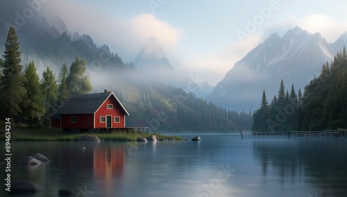 Fototapeta premium Red Cabin by Mountain Lake