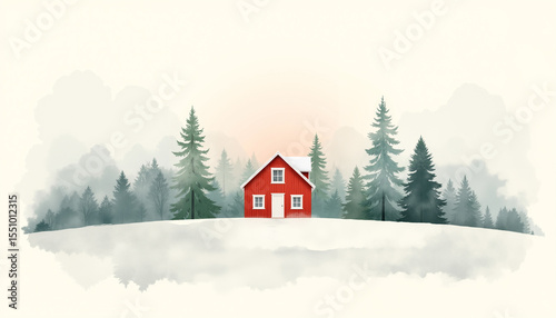 Fototapeta premium Red cabin surrounded by pine trees in a winter Nordic landscape art