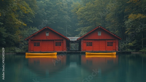 Fototapeta premium Red cabins on a serene lake, misty forest