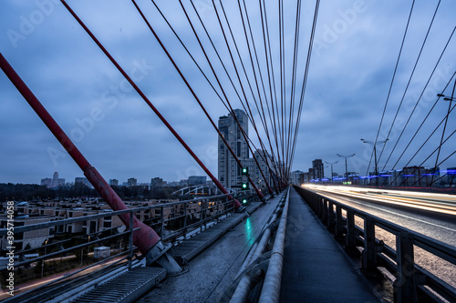 © константин константи, Obraz premium red cable-stayed bridge and freeway at sunrise on winter morning