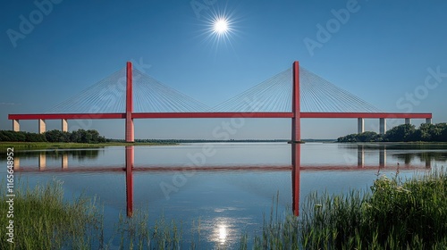 © AFFANYUDA, Fototapeta premium Red cable-stayed bridge over calm river, perfect reflection, bright sunny day.