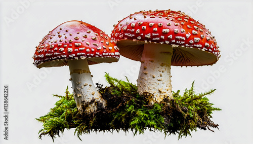 © Hassan Gallary, Obraz premium Red-Capped Mushrooms with White Dots on Moss