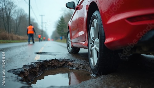 © Pete, Naklejka premium Red car drives on wet road with big pothole. Road workers in reflective vests perform repairs during rain. Infrastructure damage presents traffic danger.