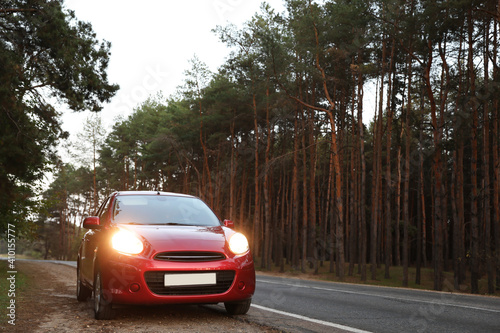 Fototapeta premium Red car parked near forest. Road trip